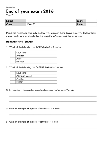 Year 7 End Of Year Exam Computing With Mark Scheme Teaching Resources