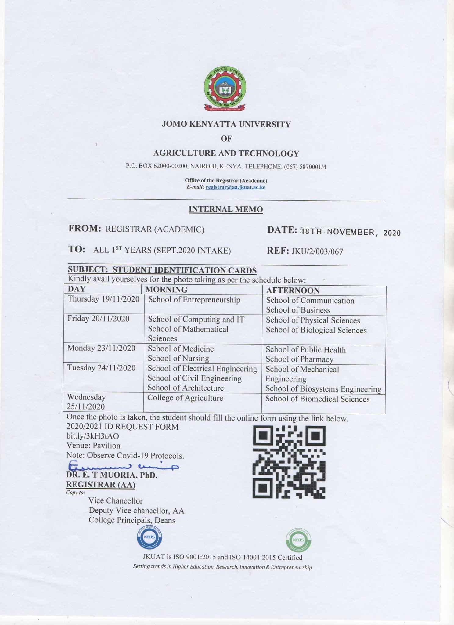 Jkuat On Twitter Attention To All 1st Year Students You Are Requested To Avail Yourselves Of A Photo Taking Exercise For Students Ids Processing Kindly Refer To The Attached Schedule And Plan Accordingly